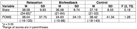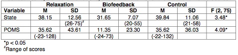 Although there was no statistical difference among the three groups in regard to the STAI and POMS scores, the biofeedback group's mean POMS score was nearly 14 points lower then the other two groups. In addition, the Bartlett-Fox F test to check homogeneity of variance showed equal variances for the STAI scores but not the POMS, with F = 3.38 and p = 0.03. There were also large standard deviations for the scores of the three psychological tests (Tables 1 and 2). This was due to the large range of scores and to a platykurtotic distribution. However, because the three groups had an equal number of subjects, violations of normality and homogeneity of variance should not affect the final analysis of variance (Dayton, 1970).