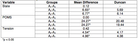 POMS: No statistical difference was found among the premean POMS scores of the three groups, with F (2, 75) = 1.28 and p = 0.28 (Table 1). A separate univariate F was also generated for each of the six adjective scales of the POMS (Table 2). Like the total mood disturbance scores (total POMS), the separate adjective mean scores did not show any significant differences. Again, the pretest data supported the lack of difference of the groups in total POMS and separate POMS adjective scores.