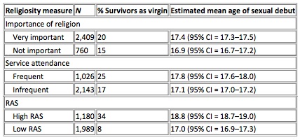 A minority of the respondents (N = 1,180 or 37%) had high attitude scores indicating that they held RAS. Those adolescents who held religious attitudes on sexuality were 54% less likely to ever have had sex compared to adolescents who had less religious attitudes on human sexuality (OR = 0.46; 95% CI = 0.41-0.51). Those who held RAS had significantly fewer lifetime sexual partners (M = 1.2, SD = 2.9 vs. M = 2.7, SD = 3.4) compared to those adolescents who held less RAS, t(3,167) = 13.0, P < 0.001. Those adolescents who had RAS had a 34% survival as virgins at the age of 21 compared to only 8% for those who did not hold RAS.