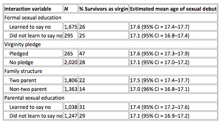 Respondents identified five sexual education topics that they discussed with their parents. How to say no to sex was the most frequently first-mentioned topic (45%), followed by none of the above (31%), methods of birth control (11%), sexually transmitted diseases (8%), how to use a condom (4%), and where to get birth control (1%). Those who identified how to say no to sex as the first topic they had talked to their parents about were 15% less likely to ever have had sex (OR = 0.85; 95% CI = 0.77-0.95) and had fewer lifetime sexual partners than those who mentioned other topics first (M = 1.4, SD = 2.5 vs. M = 1.9, SD = 3.2, respectively), t(2,283) = 3.8, P < 0.001. Rates of survival as a virgin to age 21 were essentially equivalent for adolescents whose parents promoted abstinence and those who did not.