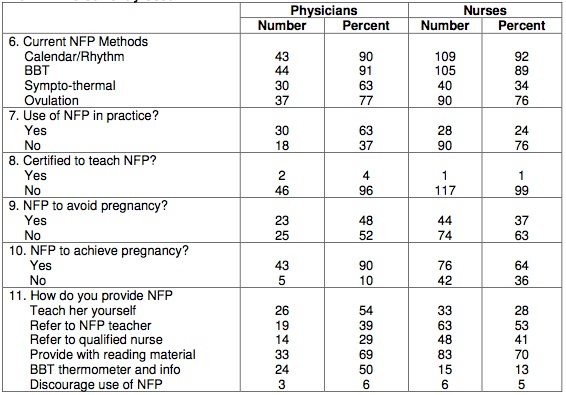 Abstract: Perinatal health professionals are in key positions to either promote or dissuade the use of Natural Family Planning (NFP). The purpose of this article is to describe a survey conducted with perinatal physicians and nurses on their knowledge and professional use of NFP. Four hundred and fifty physicians and nurses (150 MDs and 300 RNs) were sent a questionnaire on the use of and knowledge of NFP. One hundred sixty-six (or 37%) returned the completed questionnaires. Fifty-two percent of the nurses who returned the questionnaires and 48% of the physicians indicated they were taught about NFP in basic (generic) medical or nursing school. The average lecture time spent on the subject in either nursing or medical school was less than one hour. The majority learned about NFP through self-education or on-the-job training. Only four (1 RN and 3 MDs) are certified to teach NFP. Fifty-three percent of the nurses and 44% of physicians would not advise the use of NFP to avoid pregnancy. The most frequent reasons given for not promoting the use of NFP to either avoid or achieve pregnancy were that it is not effective, not natural, too difficult to learn, better methods are available, and it only works for highly motivated educated women.