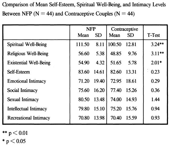 Two previous studies compared couples who use NFP with couples using artificial methods to regulate birthP Tortorici discovered that couples who used a variety of methods of NFP to regulate births had higher levels of self-esteem than couples who used a variety of artificial mehtods.[8] Fehring, Lawrence and Sauvage compared the self-esteem, intimacy and spiritual well-being (SWB) of couples using one method of NFP (i.e., the Creighton Model Ovulation Method) to avoid pregnancy with couples using one method of contraception (i.e., oral contraceptives).[17] They found that the NFP group had higher levels of SWB, self-esteem, and intimacy. The differences may have been a result of selection bias. The current study compares two groups (couples using NFP with couples using contraception) on the same variables, however, the subjects for the two groups, unlike the previous study, were randomly selected and were given in-depth interviews to enrich the results with qualitative data.