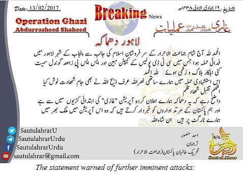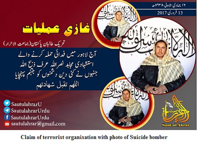 The attack in Lahore was claimed by the TTP splinter group via a statement on their Facebook and Twitter pages. The spokesperson for Jamat ul Ahrar, Asad Mansoor, stated, "Today the valiant soldiers of Jamat Al Ahrar attacked Lahore and killed CDC police officer Captain Mobin and SSP Zahid Gondal among others, Lord be Praised. Our friend Nasruallah was martyred in the jihadist attack."