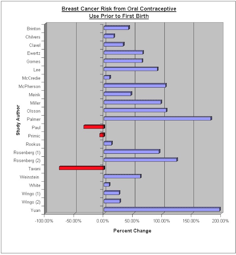 As of 2003, 18 out of 21 retrospective studies show that women who take oral contraceptives prior to their first-term birth incur an increased risk in developing breast cancer as noted in the bar graph below.