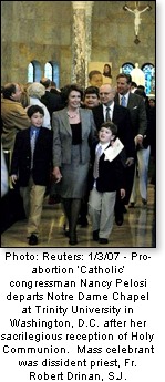 - Pro-abortion ‘Catholic’ congressman Nancy Pelosi departs Notre Dame Chapel at Trinity University in Washington, D.C. after her sacrilegious reception of Holy Communion. Mass celebrant was dissident priest, Fr. Robert Drinan, S.J.