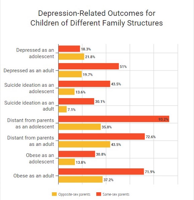 Sullins points to three things that were much more prominent among the same-sex parented group and could help account for depression: suicidal thoughts, missing a parent, and obesity.