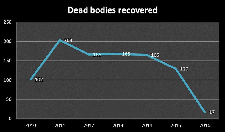 It is worthy to note that these figures have been prepared by senior government officials assigned to execute the National Action Plan (NAP) and to cracking down on terrorism and supplement the ongoing anti-terrorist offensive in North-Western Pakistan. The following is the year wise breakup of dead bodies recovered, as per the report:
